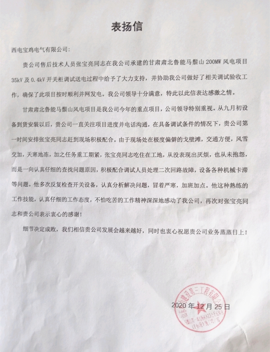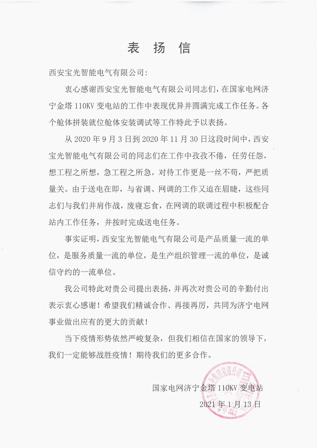 近日,西電寶雞電氣、寶光智能先后收到華能新疆吉木薩爾發(fā)電有限公司、山東電力建設(shè)第三工程有限公司、山東濟(jì)寧圣地電業(yè)集團(tuán)有限公司濟(jì)寧金塔110KV輸變電工程施工項(xiàng)目部、大唐內(nèi)蒙古分公司蒙中事業(yè)部四封感謝信。 四封感謝信都對西電寶雞電氣、寶光智能“急用戶所急、想用戶所想”的工匠精神表示高度認(rèn)可和表揚(yáng);對公司運(yùn)維服務(wù)工作人員熟練的工作技能,認(rèn)真的工作態(tài)度、不怕吃苦的工作精神表示衷心的感謝;全心全意為工程建成投產(chǎn)提供了重要保障,充分彰顯了央企擔(dān)當(dāng),并希望雙方能夠精誠合作,共同創(chuàng)造更多的精品工程。