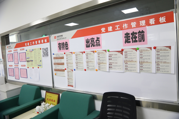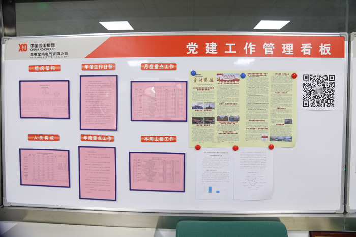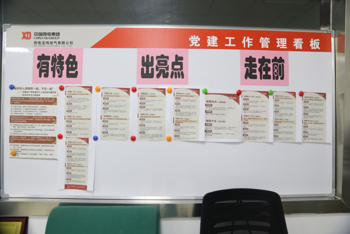 經(jīng)過西電寶雞電氣辦公樓三層西頭,大家不經(jīng)意間會發(fā)現(xiàn)兩個展板上展示著幾句鏗鏘有力的宣傳標語“黨建增進實力、黨建彰顯魅力、黨建激發(fā)活動”“聚精會神抓黨建、專心致志搞經(jīng)營、一心一意謀發(fā)展”,這只是看板背面,走進西電寶雞電氣黨群工作處,兩塊黨建工作管理看板正面一下子映入人的眼簾,吸引人的眼球,“有特色、出亮點、走在前”九字工作方針更是格外醒目,公司黨委組織架構(gòu)、黨員構(gòu)成、年度工作目標、年度重點工作,月度重點工作,本周主要工作、黨建督查情況反饋、宣傳簡報、喜迎十九大等欄目排列有序、圖文并茂、內(nèi)容詳盡。