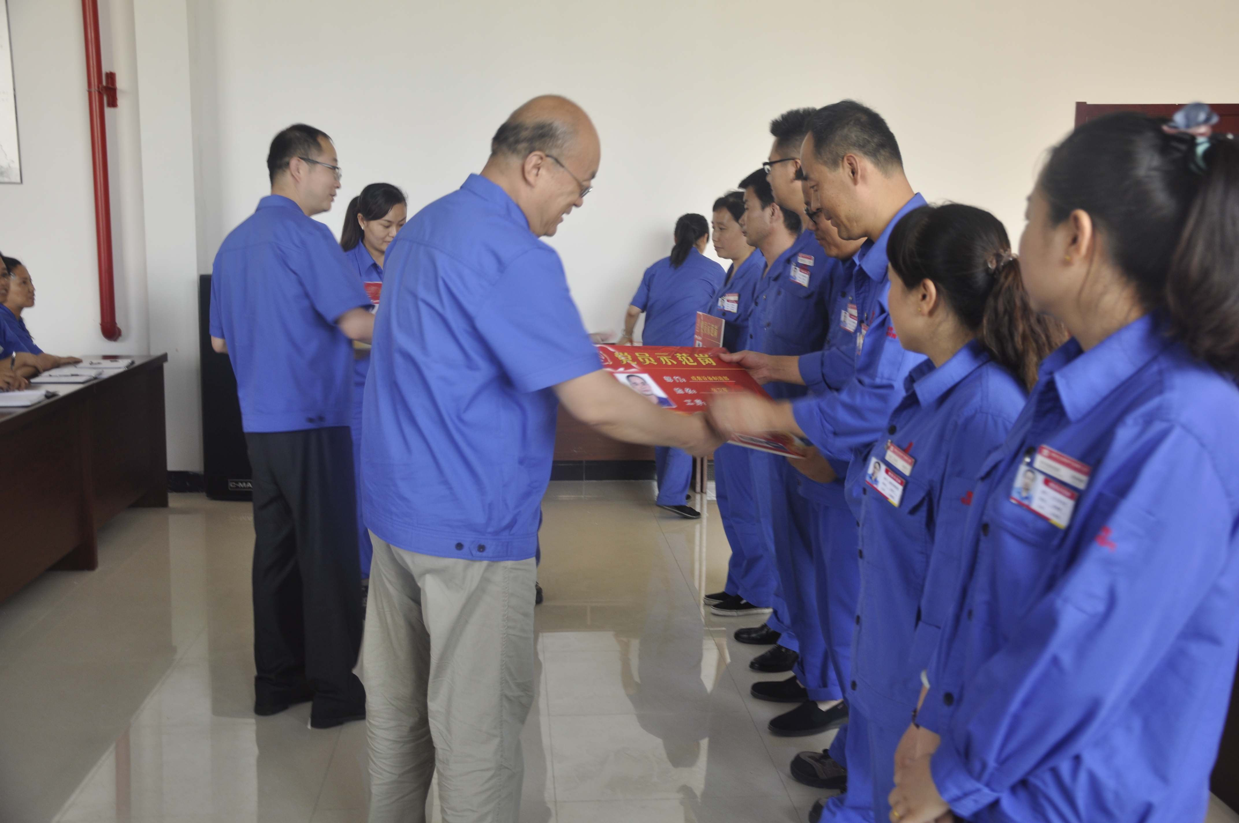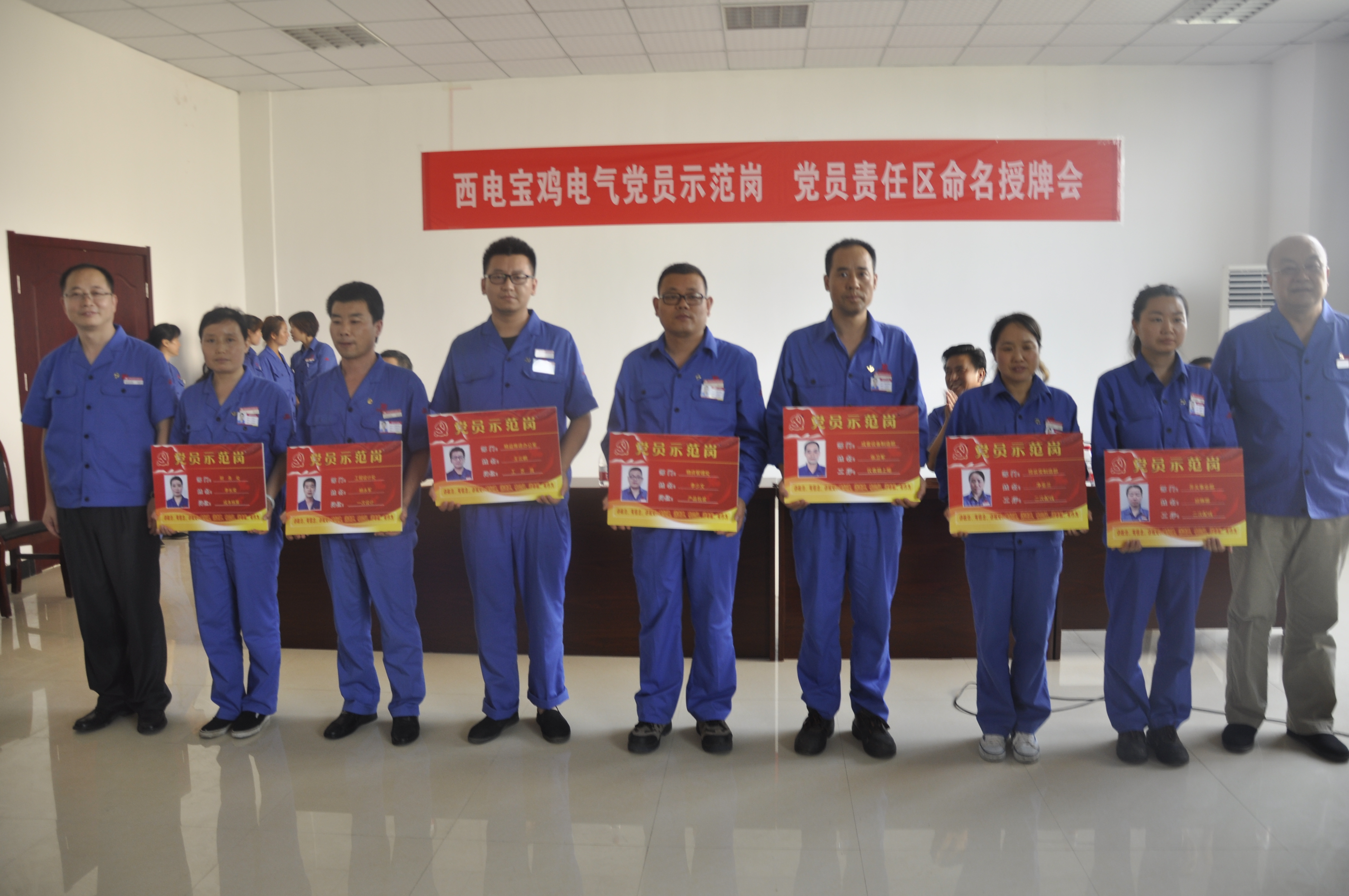 為扎實(shí)開(kāi)展“發(fā)揮先鋒模范作用,為企業(yè)改革發(fā)展提質(zhì)增效做貢獻(xiàn)”黨員主題實(shí)踐活動(dòng),8月4日下午,公司舉行“黨員示范崗、黨員責(zé)任區(qū)”命名授牌儀式。公司執(zhí)行董事、黨委書(shū)記雒濤、總經(jīng)理朱安珂為財(cái)務(wù)處李長(zhǎng)榮等7個(gè)“黨員示范崗”和成套設(shè)備制造部鈑金T線等3個(gè)“黨員責(zé)任區(qū)”授牌。楊永軍同志代表“黨員示范崗”、“黨員責(zé)任區(qū)”的同志作了表態(tài)發(fā)言。公司黨委副書(shū)記紀(jì)委書(shū)記付宗喜主持授牌儀式。各黨支部書(shū)記、相關(guān)處室負(fù)責(zé)人、“黨員示范崗”、“黨員責(zé)任區(qū)”及部分黨員代表共50余人參加了授牌儀式。